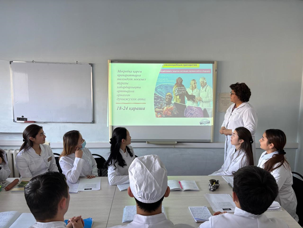 Сонымен қатар кафедра қызметкерлері – Пивень Л.И., Ким Т.В., Николаева Т.Л., Сыздикова Ж.В., Сабекова О.Ж., Симохина Н.А., Бикбатырова Ю.Ю., Ахмедия Р.Е., Аят Ж.Б., Сагадатова Т.К., Тусенова М.Т., Салибекова Ч.З. – студенттермен ақпараттық әңгімелесулер өткізді. Әңгімелесулер антибиотикке төзімділік мәселесі туралы хабардарлықты арттыруға және бактерияға қарсы дәрілерді жауапты қолданудың маңыздылығын түсіндіруге бағытталды. Әңгімелесулерге «Медицина», «Жалпы медицина», «Педиатрия», «Фармация» мамандықтарының студенттері, сондай-ақ Халықаралық медицина факультеттің студенттері қатысты.