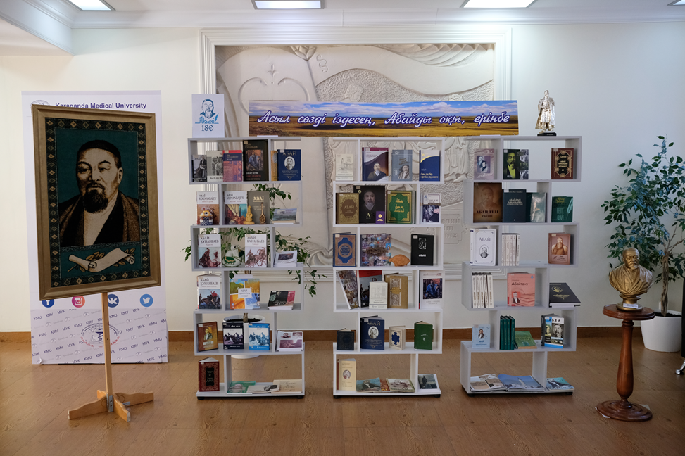 Фойеде Абай, Шәкәрім және Ахат Шәкәрімұлының шығармашылығына арналған еңбектермен танысу мақсатында кітап көрмесі ұйымдастырылды.