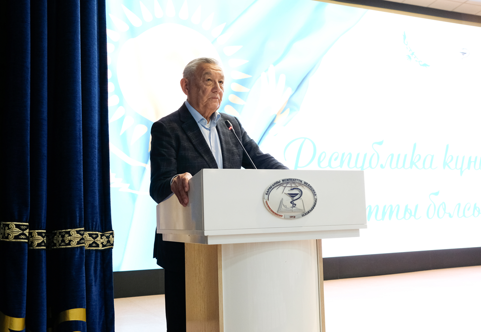 Қарағанды медицина университетінің ректоры, медицина ғылымдарының докторы, профессор Көшерова Бақыт Нұрғалиқызы ұжымды мерекемен құттықтап, оқу орнының дамуына қосқан үлесі үшін алғысын білдірді. Өз сөзінде Республика күні – еліміздің егемендігі мен тәуелсіздігінің негізін айқындайтын, мемлекеттік маңызы зор тарихи күн екенін ерекше атап өтті.