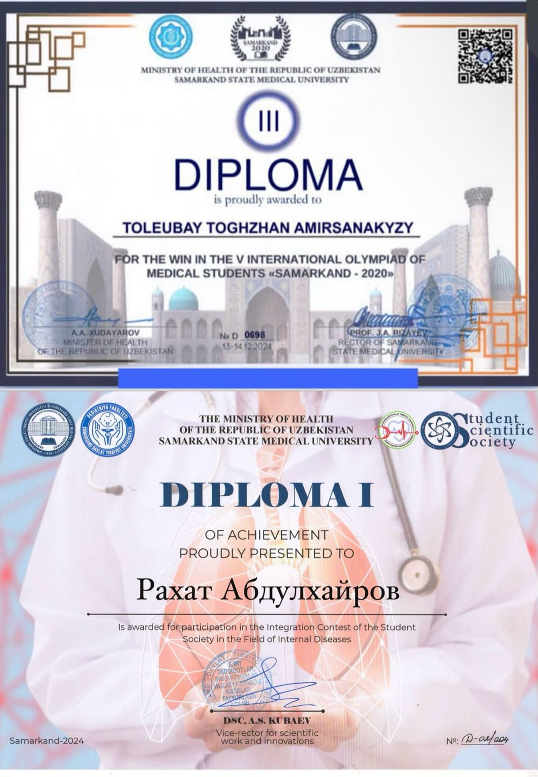 2024 жылдың 13–14 желтоқсаны аралығында «Самарканд – 2020» медицина университеттер студенттері арасындағы V –Халықаралық олимпиада өтті. Олимпиада жетекші медициналық оқу орындары өкілдерінің алаңы болды. Олимпиада онлайн және офлайн форматта өтті. Олимпиядағы студенттік ғылыми үйірмедегі 6-7 курс интерндері қатысты. Ғылыми жетекшілері «Отбасылық медицина» кафедрасының ассисстент-профессоры Батырбекова Лазат Сарсенбаевна.