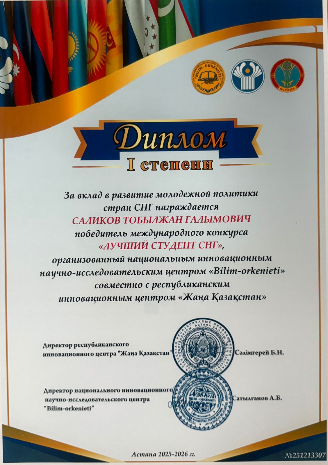 2025 жылғы 13 желтоқсанда Астана қаласында Қазақстан Республикасының Тәуелсіздік күніне орай «ТМД-ның үздік студенті 2025-2026» халықаралық конкурсының марапаттау рәсімі өтті. Аталған конкурсқа ТМД елдері мен жақын шет мемлекеттерден студенттер қатысты: Қазақстан, Өзбекстан, Қырғызстан, Тәжікстан, Түрікменстан, Ресей, Үндістан.«ТМД-ның үздік студенті» құрметті атағы мен I дәрежелі дипломымен «Педиатрия» білім беру бағдарламасының 2-курс резиденті Саликов Тобылжан Ғалымұлы марапатталды.