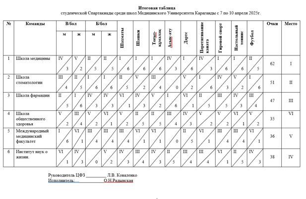 Итоги студенческой спартакиады среди школ Карагандинского медицинского университета с 7 по 10 апреля 2025г.