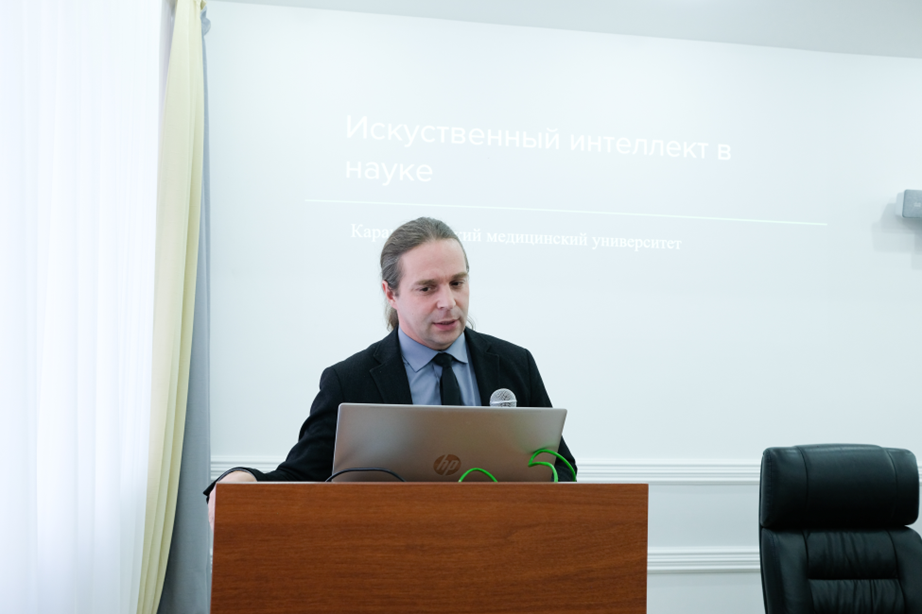 Обсуждение продолжилось выступлением проектора по стратегическому развитию и международному сотрудничеству В.П. Риклефса, который озвучил государственную политику развития ИИ в образовании, рассказал о внедрении инструментов Искусственного интеллекта в образовательный процесс КМУ.